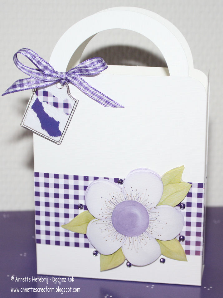 Dit tasje had ik nog als voorbeeld gemaakt voor de workshop van afgelopen zaterdag. Als opmerking zei ik tegen Els: "Dit maak ik voor mijn broer, want ik heb het gevoel dat het een meisje wordt, heb ik vast een kadoverpakking". Negen van de tien keer heb ik gelijk. En wat blijkt? Mijn broer belde dat hun dochter vandaag is geboren. Weer goed geraden dus. ;-) Maar help, de andere kado's zijn nog niet klaar. Bij de eerste van zowel mijn broers als van de kant van Henk geef ik een kraampakket. Voor iedere dag één kado. Ze is dus een beetje aan de vroege kant, want T. Annette heeft ale kado's nog niet klaar. Hahaha. Zij is geboren in het westen van het land, dus nog even kijken wanneer wij op kraamvisite gaan?